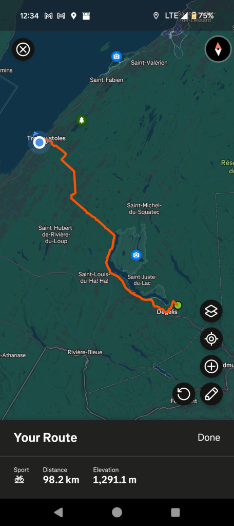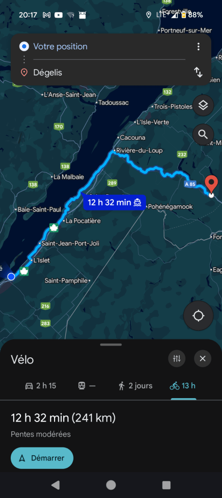 Demain je me rends enfin Dégelis et je fais mes premiers Kilomètres à l’extérieur du Québec. Enfin j’espère.