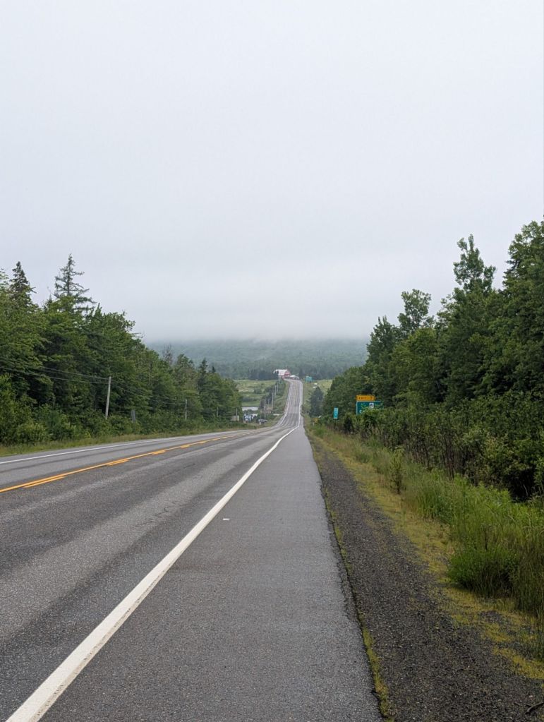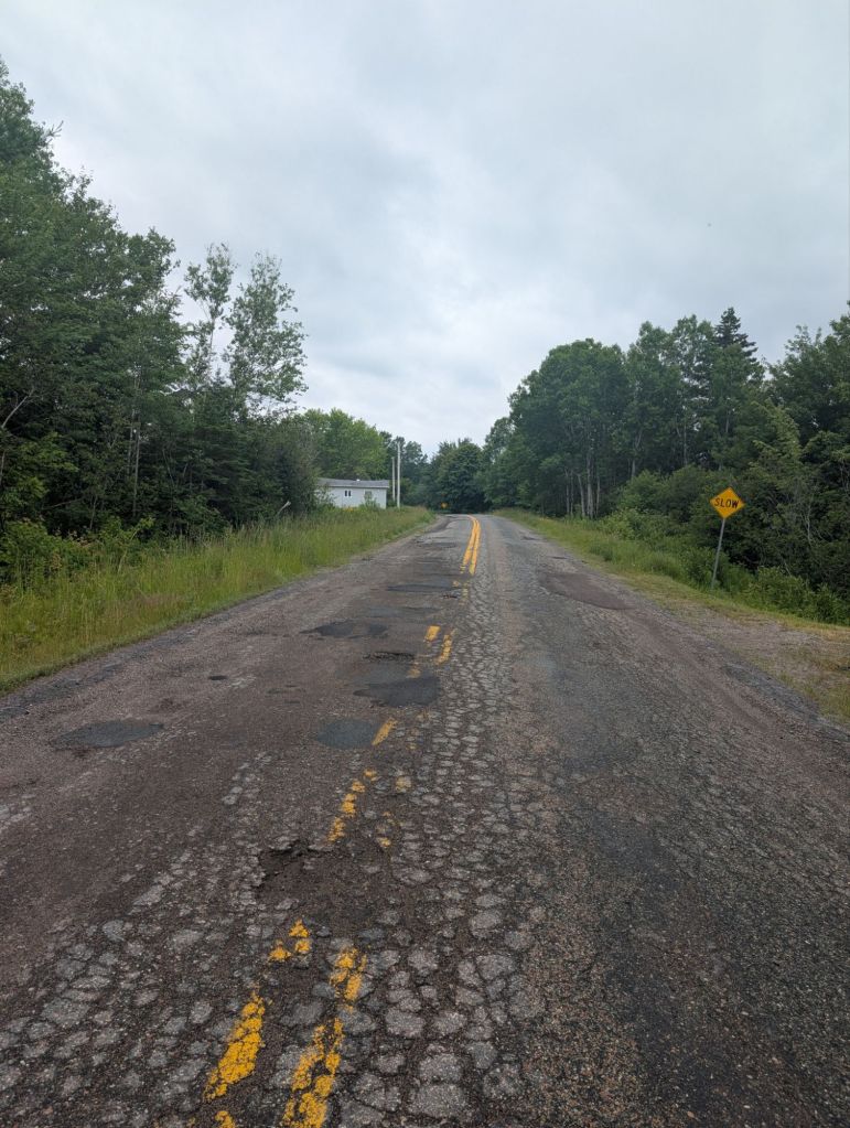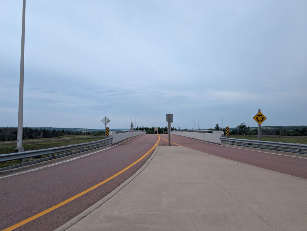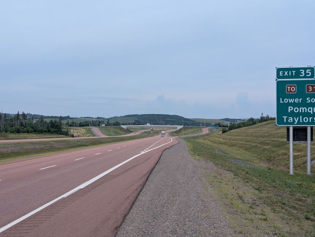 Pour prendre le traversier, je dois me rendre à Pictou puis à Caribou juste à côté. La meilleur façon de s’y rendre en bicycle est le Sunrise Trail, ou la route 4. Cependant cette route ce merge avec l’autoroute pour une quinzaine de kms. Personne n’a pu prédire qu’un fou furieux tenterait de faire le tour de la province en bicycle en pédale, donc je doit continuer à terrorisés les gens sur l’autoroute.