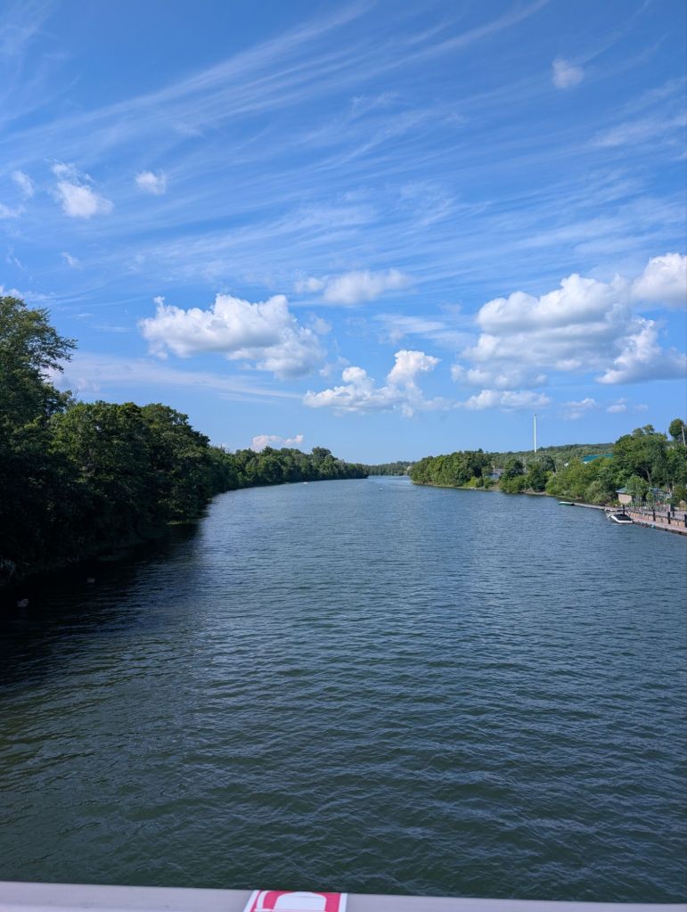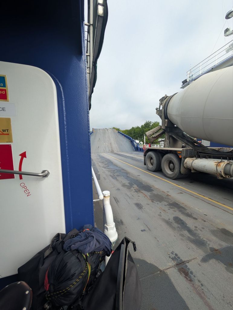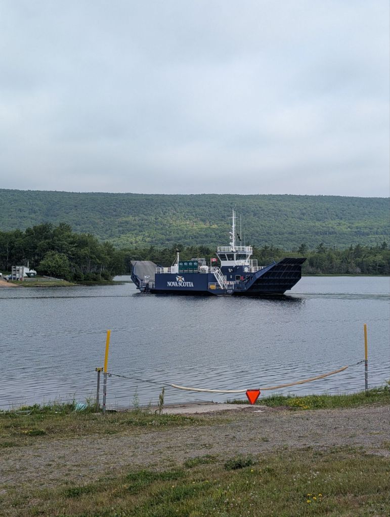 Au lieu de risquer de me faire anéantir si je tente trop la foie en restant sur l’autoroute, je prends un bateau à Little Narrows qui m’emmène de l’autre côté de la rivière. Le timing est vraiment bon, car le traversier arrive en même temps que moi.