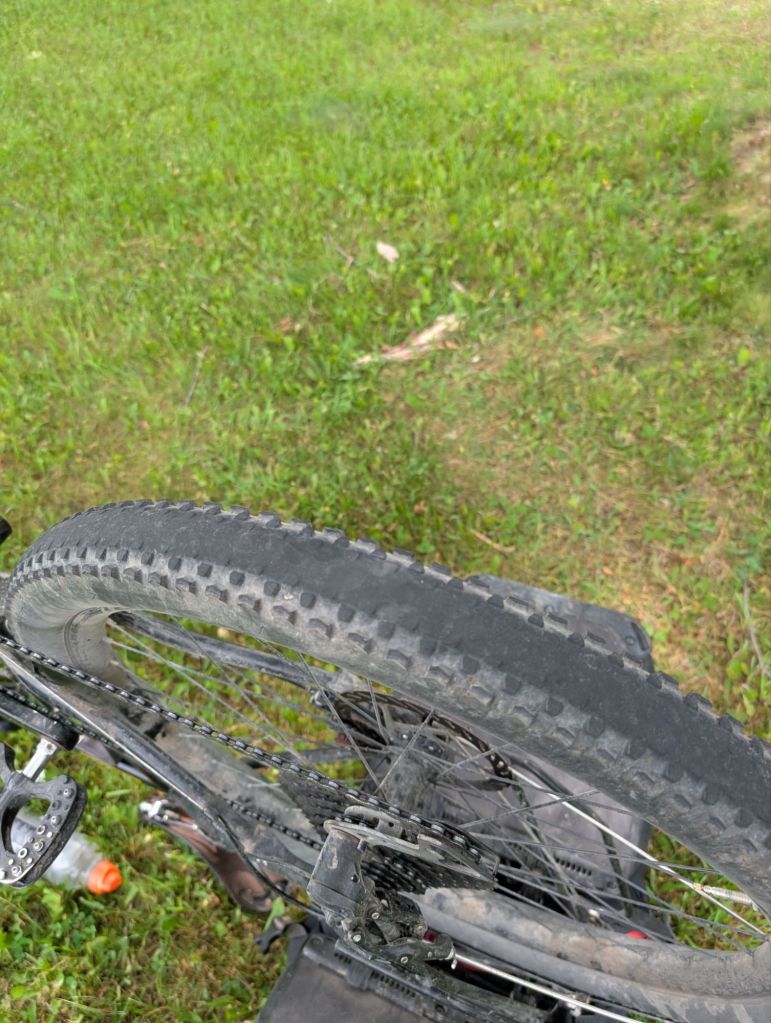 Premier flat de pneu aujourd’hui. La roue d’avant. Pas trop pire, un flat après environ 3500km. Mais je soupçonne que mes pneus commencent à être usées. Je confirme, le filetage de mon pneu arrière est complètement décimé. La durée de vie du pneu est censée être d’ environ 5000 km, mais le surplus de poids et le freinage sur les pentes abruptes à dû l’achever plus rapidement.
