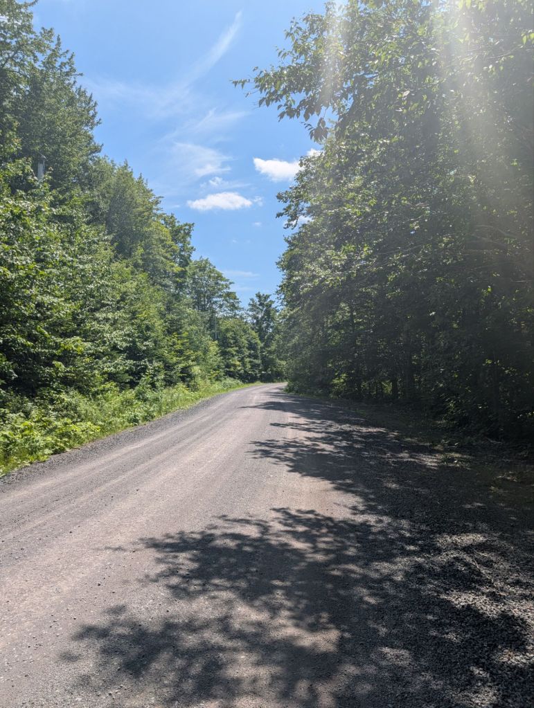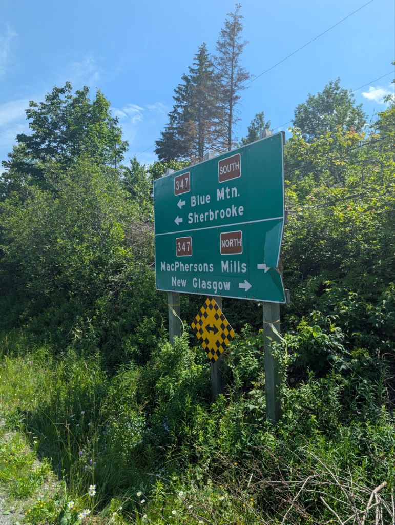 Je frappe un chantier de construction sur la route 4 et je me trompe de chemin, car je me fais fourrer par une auto de guide. Je me ramasse perdu dans une forêt au milieu de nulle part. Il s’agit en fait d’un chemin qui sert a passer des poteaux électriques et qui sert de trail de VTTs aussi. Ça me va parce que la trail est vachement mieux tappé que la plupart des sentiers « multi-usage » que j’ai vu jusqu’à maintenant. Ça me mène à la route 347 qui se rend directement à New Glasgow.