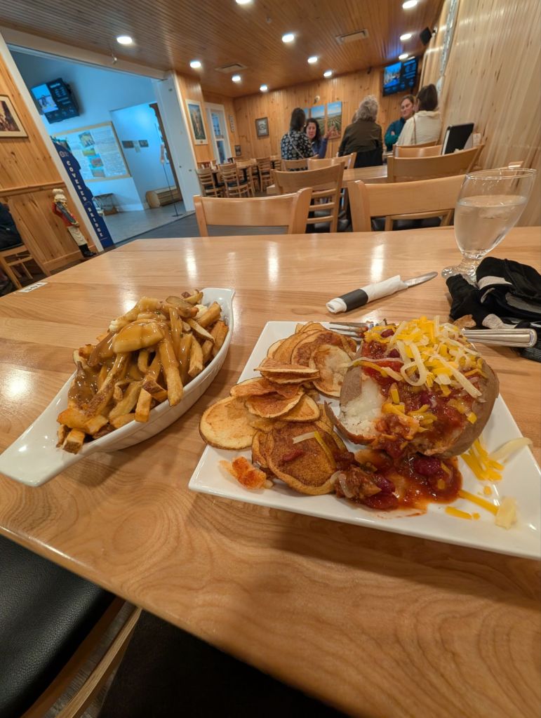 Je m’installe au resto dans le musée et pour environ 20$ j’ai droit à une grosse patate cuite et une petite poutine. La bouffe est prête en moins de 5 minutes, en plus! Les patates sont fraîches et délicieuses.