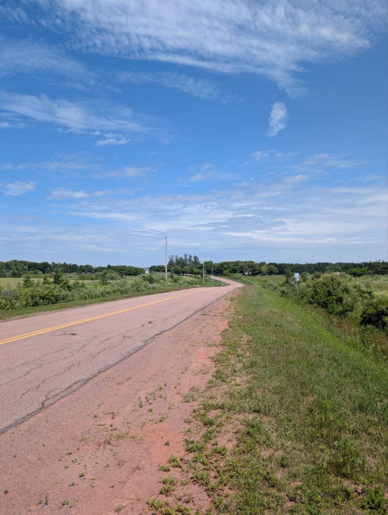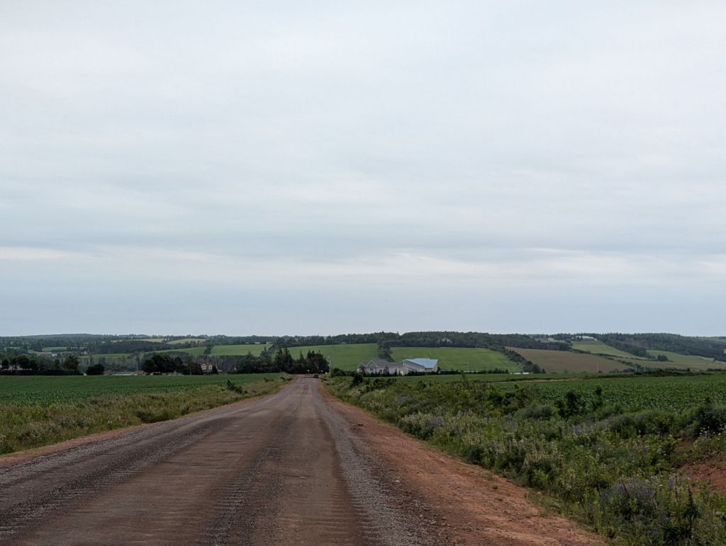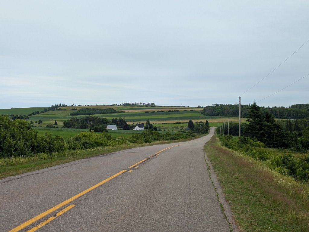 Une fois retourné à Kensington, je me dirige au nord de l’île et vers Cavendish. C’est pas mal plus la campagne ici. Beaucoup de fermes et beaucoup de collines. Certaines collines sont tellement terribles qu’elles me font penser aux hautes-terres du Cape Breton. La vue est très belle, par contre. C’est le plus bel endroit sur l’île jusqu’à date, selon moi.