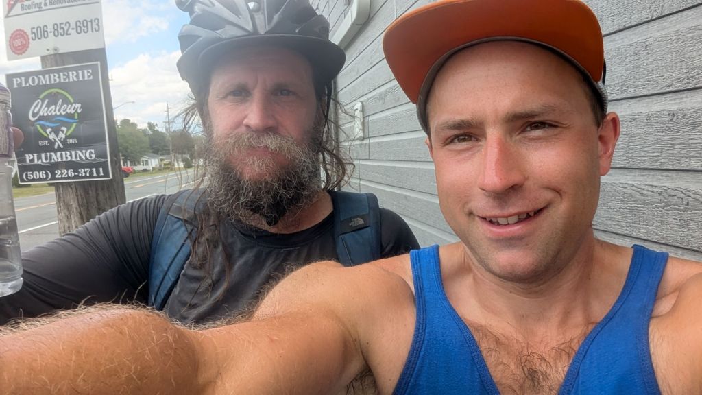 Cependant je ne suis pas seul. Je me suis fait un nouvel ami à Boutchouc hier. Guillaume est un Québécois qui fait un voyage similaire au mien et qui se dirige aussi vers Campbellton, et je le rencontre une autre fois sur la route par hasard. On se dirige ensemble vers Miramichi. On croisent une autre gang de cyclotouristes de l’autre bord, aussi