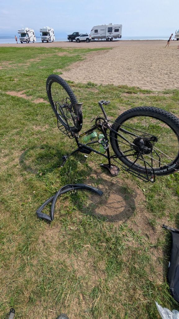 Le lendemain matin, je pogne un autre maudit flat dans le coin de Charlo. Le pneu arrière ce coup là. La dernière fois, c’était mon pneu avant. La balance de l’univers est maintenant restaurée.