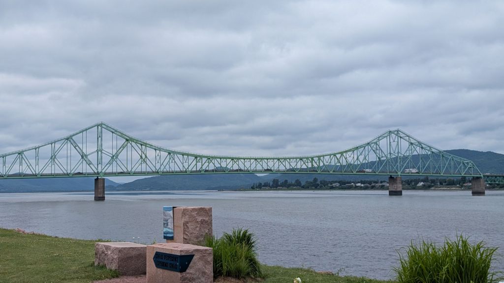 Il faut noter la forme du pont. Ça là quoi donner le vertige! Heureusement il y a un trottoir. Cependant, le pont est dû pour être rénové. Il s’agit d’un énorme projet. Le trottoir à besoin d’être refait aussi, car il est pas mal endommagé. Ça tombe en muettes et il y a plusieurs trous.